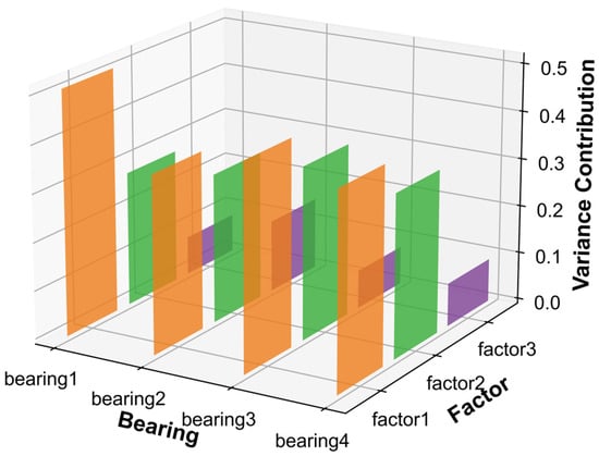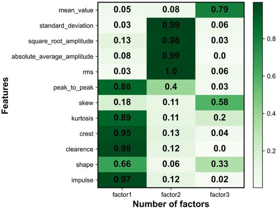 Twelve statistical features are extracted from the raw data using signal processing techniques, requiring an adequacy test before factor analysis can be performed. Bartlett’s spherical test and KMO test are used to show that this type of data can be used for factor analysis. The correlation matrix of the population variables is examined to see if it is a unit matrix, and if it is not a unit matrix, it indicates that there is a correlation between the original variables and factor analysis can be performed. Correlations and skewness correlations between variables are tested and take values between zero and one. The closer the KMO statistic is to one, the stronger the correlation between variables and the weaker the skewness correlation, therefore the better the factor analysis is. In this paper, the IMS bearing dataset was used as an example for illustration. A factor analysis model was developed for the extracted 12 features, the factors were rotated using variance maximization and three common factors were selected after factor analysis. To observe more intuitively which features were more relevant for each hidden variable, a heatmap of the factor matrix was drawn, based on the absolute values of the correlation coefficients. Figure 6 shows the relationship between different bearings and the common factors, from which it can be seen that the correlation between the three common factors was weak and the data dimensionality reduction was achieved. Then, the variance contribution rate of the rotated common factors was calculated, to select the common factor with the largest contribution rate as the health indicator of the bearing. Figure 7 shows the variance contribution rate for different bearings. Figure 8 shows the health indicators constructed based on multi-feature factor analysis.
