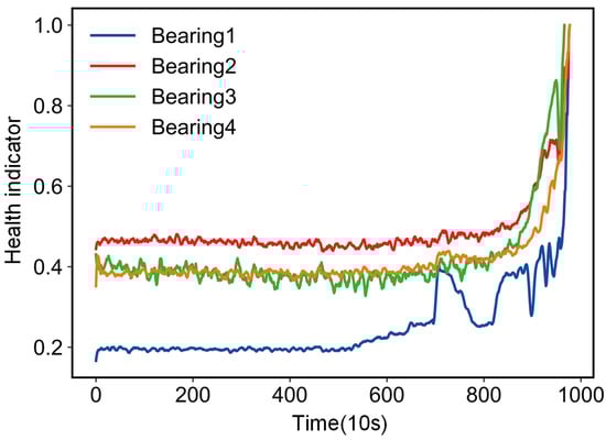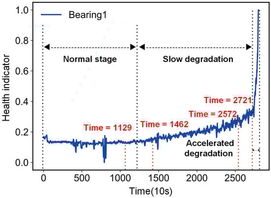 Studies have found that the accuracy of health indicators will affect the accuracy of remaining life prediction, and constructing appropriate health indicators can help improve the predictability of mechanical equipment. Health indicators can be divided into two categories: physical health indicators and virtual health indicators. Briefly, physical health indicators are usually extracted from vibration signals using statistical methods. In contrast, virtual health indicators are mainly constructed by fusing multiple physical health indicators. Various physical characteristics are used as health indicators in many studies, such as root mean square (RMS) and peak values. Based on the instantaneous definition of Shannon’s spectral entropy, Civera et al. [13] used the instantaneous spectral entropy as a health indicator, thereby achieving condition monitoring of wind turbines. In fact, due to the complex internal structure and variable operating environment, a single physical feature extracted from raw monitoring data cannot fully capture failure trends over the lifetime of a machine [14,15]. In feature level fusion studies [15,16,17], by building an optimized model of features, the optimal features are selected for constructing health indicators. However, there are many random fluctuations in the health indicators constructed based on multi-feature fusion, and there is no solution for such stochastic fluctuations in the above method. Ahmad et al. [18] have proposed a linear correction technique to deal with random fluctuations, to fit the increasing trend of health indicators. In Yan et al. [19], a smoothing method is proposed, based on different regression models, to deal with anomalous fluctuations in health indicators. The above methods ensure the health indicators have a clear monotonic trend by processing the stochastic fluctuations, which satisfies the prognostic requirement of the monotonicity of the health indicators. Regarding the effective handling of spurious fluctuations [20], it would be beneficial to identify the starting point of bearing degradation, which in turn would improve the prediction accuracy. However, these methods weaken the degradation trend of the bearings during processing and cannot accurately distinguish the different degradation stages of the bearings.