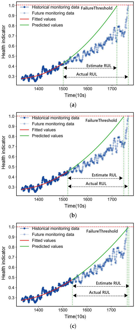 RUL prediction process of bearing3. (a) RUL predicted trajectory at the time 15,000 s. (b) RUL predicted trajectory at the 15,200 s. (c) RUL predicted trajectory at the time 15,200 s.