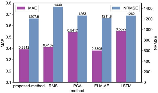 In addition, the mean absolute error (MAE) [29] and the normalized RMS error (NRMSE) of the predictions in the PHM2012 dataset are calculated separately. Among them, RMS is a commonly used traditional health indicator in the field of residual life prediction, principal component analysis (PCA) is a machine learning method for constructing virtual health indicators, and extreme learning machine auto code (ELM-AE) is a deep learning method. These four existing methods for constructing health indicators, and the proposed method, are used to validate the effectiveness of predicting the remaining service life of bearings based on health indicators. The evaluation criteria are used to analyze it, as well as the results, are shown in Figure 12. Compared with a single structured deep learning network, the proposed method can effectively increase the prediction accuracy. At the same time, it improves the accuracy of the remaining useful life prediction, compared to traditional health indicator construction methods.