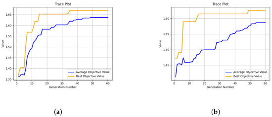 Figure 3 represents the convergence curves of the DE algorithm for 5 and 10 training rounds. The horizontal axis denotes the number of population evolution generations and the vertical axis indicates the objective value. It can be observed that the DE algorithm converges well and obtains the best objective value at the 35th and 49th generation, respectively. Meanwhile, the average objective value also converges and has the maximum value at the 49th and 54th generation, respectively. This shows that the algorithm evolves correctly and the best objective value obtained is the global optimal solution.