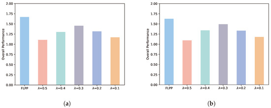 Figure 4 illustrates the comparison between the FLPP and five fixed privacy level schemes. We denote the objective value of the scheme, i.e., the overall performance, by Equation (27). It can obviously be seen that the overall performance of FLPP is better than other fixed schemes at different numbers of training rounds. This indicates that FLPP can achieve the optimal decision according to different numbers of training rounds. At five rounds of training, FLPP has an advantage of 34%, 22%, 13%, 21% and 30% over the fixed privacy level schemes, respectively. At 10 rounds of training, the overall performance of FLPP improves by 33%, 18%, 8%, 18% and 28%, respectively, over the comparison schemes. We can conclude from the results as below. A fixed privacy level cannot effectively cope with the changeable training environment. The FLPP scheme can dynamically adjust the privacy level according to the actual situation of each training round to achieve the best training outcome. In addition, the increase in training rounds can narrow the gap between the comparison schemes and FLPP. However, the number of training rounds is limited in mobile edge computing scenarios. Mobile devices cannot stay in the range of one server for a long time to participate in federated learning. Therefore the FLPP scheme is suitable for this research scenario.