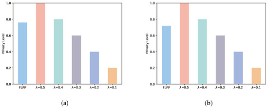 The differential privacy technique is a good way to avoid the computation load and communication overhead. Wang et al. [22] proposed a collaborative filtering algorithm recommendation system based on federated learning and end–edge–cloud computing. The exposure of private data was further prevented by adding Laplace noise to the training model through DP technology. Wei et al. [23] proposed a novel DP-based framework, NbAFL, in which artificial noise is added to parameters at the clients’ side before aggregating. The strategy for achieving the optimal performance and privacy level is performed by selecting the number of clients participating in FL. Zhao et al. [24] propose an anonymous and privacy-preserving federated-learning scheme for the mining of industrial big data, which leverages differential privacy on shared parameters. They also test the effect of different privacy levels on accuracy. Adnan et al. [25] conduct a case study of applying a differentially private federated-learning framework for analysis of histopathology images, the largest and perhaps most complex medical images. Their work indicates that differentially private federated learning is a viable and reliable framework for the collaborative development of machine learning models in medical image analysis. However, the DP privacy level of these works is fixed so it cannot adapt to the dynamically changing sets of participating aggregation clients. In particular, non-IID data distribution with fixed privacy level may slow down the speed of FL model training to reach the anticipated accuracy.
