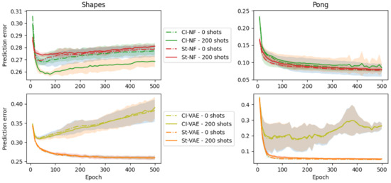 The 0-shot OOD error and 200-shot OOD error (lower is better) that a model achieves if the source-domain pretraining checkpoint at the epoch indicated on the x-axis is taken. The Standard models (St-VAE and St-NF) are shown in orange/red and the CITRIS models (CI-VAE and CI-NF) in green/olive. The left figures show results for the Shapes dataset and the right for the Pong dataset. The top figures show the Normalizing flow backbone and the bottom figures the VAE backbone. The line indicates the average of five runs, with the shaded areas indicating the standard deviation.