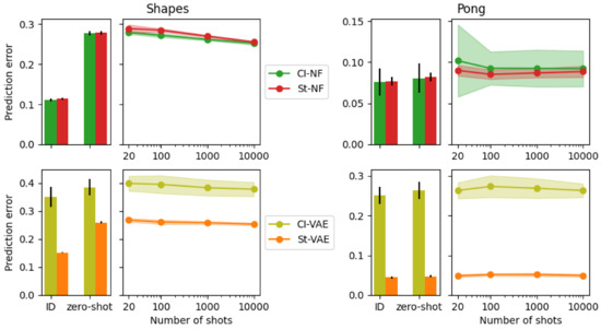 In-domain error, 0-shot error, and few-shot error of models after pretraining for 500 epochs. The Standard models are shown in red/orange and the CITRIS models in green/olive. The left figures show results for the Shapes dataset and the right for the Pong dataset. The top figures show the NF backbone and the bottom figures the VAE backbone. The average of five runs is shown, with the error bars/shaded areas indicating the standard deviation. The x-axis indicates in-domain or zero-shot out-of-domain for the bar charts and the number of shots used for the line plots.