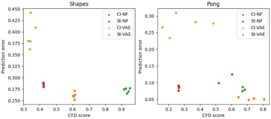 Correlation between few-shot prediction performance and Causal Factor Disentanglement. The y-axis shows 100-shot prediction error after pretraining for 500 epochs. The x-axis shows the CFD Score. Results for the Shapes dataset are on the left, and for Pong, on the right.