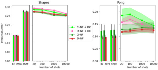 Figure 4 also shows the error, but displays the number of shots on the x-axis, rather than the pretraining epoch as in Figure 3. The pretraining epoch is fixed to 500.