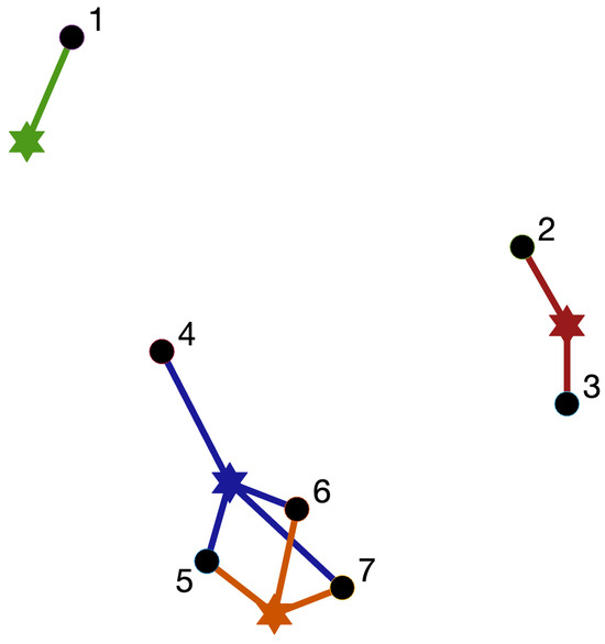 Figure 1 illustrates the idea in the two-dimensional case. We have a bipartite graph with two types of nodes. Groups A and B are represented by circles and stars, respectively. We form a hypergraph by placing a circle node in a hyperedge if and only if it is within a certain distance of the corresponding star. Colours in the figure distinguish between the different hyperedges. We emphasise that mathematically the resulting hypergraph consists only of the list of hypergraph nodes and hyperedges. Information about the existence/number of hyperedge centres and the locations of all nodes in