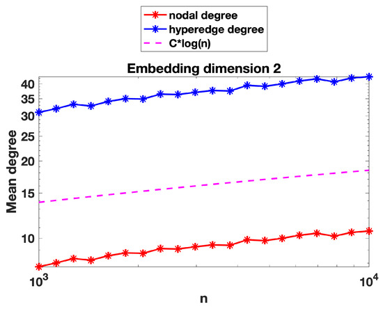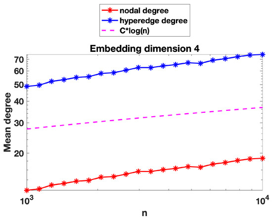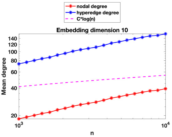Figure 7 we used the same random geometric hypergraph samples, each evaluated at its connectivity threshold. For each hypergraph, we computed the expected node degree and expected hyperedge degree, that is, for the underlying bipartite graph, the expected degree of the nodes in group A and in group B. The figures, which again are on a log–log scale, indicate that the two expected degrees grow slowly with