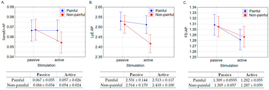 ANOVA results, mean and standard deviations for the stimulation (passive, active) and valence (painful, non-painful) factors for (A). Sample Entropy (SampEn), (B). the Lyapunov exponent (LyE) and (C). Fractal Dimension (FD) for the time series COP in anteroposterior (AP) direction.