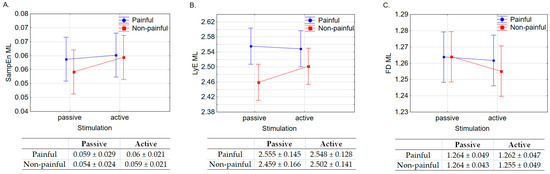 ANOVA results, mean and standard deviations for the stimulation (passive, active) and valence (painful, non-painful) factors for (A). Sample Entropy (SampEn), (B). the Lyapunov exponent (LyE) and (C). Fractal Dimension (FD) for the time series COP in the mediolateral (ML) direction.