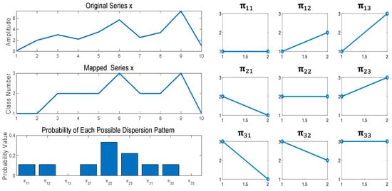- Lastly, DE is obtained using the Shannon entropy approach [25] as follows:For example, is considered and shown on the top left of Figure 1. DE of with d = 1, m = 2, and c = 3 is computed in Table 1 and Figure 1. Table 1 shows the dispersion patterns and their probability. Figure 1 shows the time series x, classified series z, potential dispersion patterns and probability of each potential dispersion pattern.