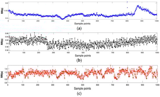 Real ECG datasets, i.e., BIDMC CHF, MIT-BIH AF, and Fantasia are obtained in PhysioNet [26]. Specifically, BIMD CHF contains ECG records of 15 patients with CHF, consisting of eleven men aged 22–47 years and four women aged 54–63 years. Each recording is approximately 20 h in duration with a sampling frequency of 250 Hz. MIT-BIH AF database includes 25 long-term (10 h) ECG recordings of twenty-three paroxysmal and two persistent. The Fantasia dataset contains 20 healthy subjects aged 21–34 years and 20 elderly subjects aged 68–85 years. Each recording is approximately 2 h in duration and sampled at 250 Hz. RR intervals with lengths of N = 1000 were randomly extracted from ECG recordings. Recording an ECG signal typically involves placing electrodes on the skin at specific locations to capture the electrical activity of the heart. Then, the ECG lead that gives the clearest R waves is chosen, followed by the detection of QRS waves. The R and QRS waves are extracted using the Pan-Tompkins algorithm [27]. Then, the RR interval on the ECG signal is obtained as the time between consecutive R waves, which are the prominent upward spikes seen on an ECG trace. The representative RR interval time series of CHF patient, AF patient, and healthy subject are shown in Figure 3a–c. For analyzing ECG signals, MATLAB 2020b version was used.