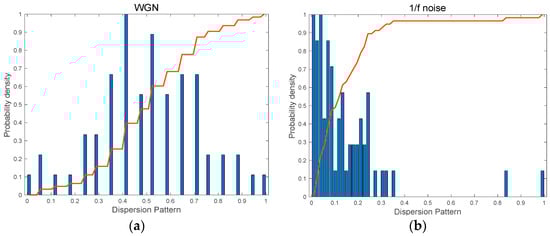 Figure 4 shows the probability density function (PDF) of possible dispersion patterns which are presented with normalized values and corresponding cumulative distribution curves of the probability distribution for the possible dispersion patterns. The histogram of the dispersion pattern for WGN is roughly a normal distribution shown in Figure 4a. However, 1/f noise has a left-skewed distribution. As can be seen, 1/f noise has a steeper accumulation rate, resulting in relatively higher complexity than WGN.