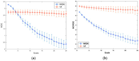Figure 5a,b demonstrate the entropy values of MDE and MCRDE consisted of 50 different 1/f noise and WGN with the length of N = 1000, respectively. It has been known that 1/f noise has a higher complexity than WGN [26,27]. The results of MDE in Figure 5a show two folds: First, at small scale factors less than 5, MDE values of WGN are higher than those of 1/f noise. Second, as the scale factor increases, MDE values of 1/f noise remain nearly constant, while MDE values of WGN monotonically decrease. The results of MCRDE in Figure 5b shows that MCRDE values of 1/f noise computed remain almost constant. In addition, the entropy values of WGN by MCRDE are less than those of 1/f noise by MCRDE on all scale factors and decrease as the scale factors increase. These results imply that the proposed MCRDE is more capable of discriminating complexity in underlying synthetic signals compared to MDE.