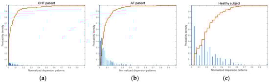 Figure 6a–c depict the histograms for dispersion patterns and corresponding cumulative distribution curves for the RR interval time series of three groups, respectively. As can be seen, the slope of the cumulative distribution curve decreases in the order of CHF patient, AF patient, and healthy subject. As shown in Figure 6, the variation in RR intervals of CHF patients is the smallest among the three groups. In addition, the occurrence of the dispersion patterns is concentrated on low values, and the slope of the cumulative distribution curve is the highest among the three groups. In the case of AF patients, the RR interval shows more diverse dispersion patterns, and the slope of the cumulative distribution curve is smaller than that of CHF. Lastly, the RR interval of the healthy subject shows the most significant variation among the three groups, implying that more diverse dispersion patterns occur, and thus, its slope of the cumulative distribution curve is the lowest.