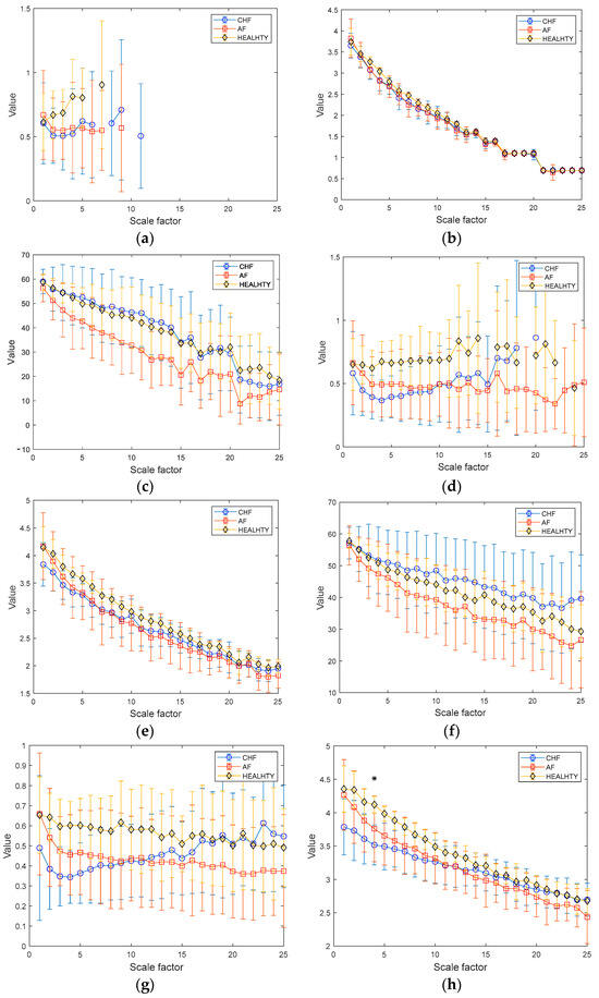 Statistical results using the Mann–Whitney U test suggest the following: First, MCRDE is capable of discriminating the complexity between CHF and AF subjects as well as between AF and healthy subjects with short-length RR intervals, while MSE and MDE cannot be computed at high scale factors, and MDE can discriminate different statuses at less scale factors than MCRDE. Second, for longer lengths of RR intervals, MCRDE has a better capacity for discriminating between CHF and healthy subjects. In addition, MDE performs better in discriminating between AF and healthy subjects at small scale factors, while MCRDE shows better performance over higher scale factors. It suggests that MDE and MCRDE can be combined to distinguish between AF and healthy subjects.