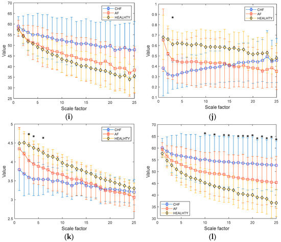 MSE, MDE, and MCRDE results of RR intervals for CHF patients, AF patients and healthy group: (a) MSE for N = 100; (b) MDE for N = 100; (c) MCRDE for N = 100; (d) MSE for N = 250; (e) MDE for N = 250; (f) MCRDE for N = 250; (g) MSE for N = 500; (h) MDE for N = 500; (i) MCRDE for N = 500; (j) MSE for N = 100; (k) MDE for N = 500; (l) MCRDE for N = 500. The scale factor ranges from 1 to 25. The entropy value at each scale factor represents a mean standard deviation. The asterisks indicate a significant difference between groups obtained via Mann–Whitney U test (p < 0.05).