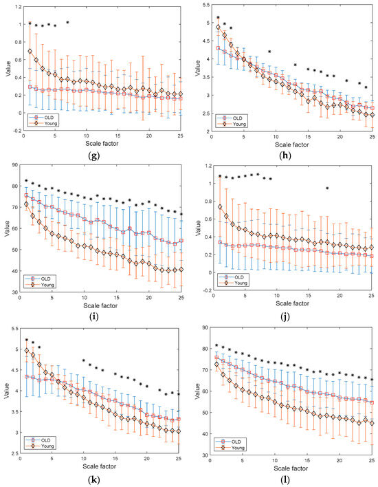 MSE, MDE, and MCRDE results of RR intervals for healthy and old group: (a) MSE for N = 100; (b) MDE for N = 100; (c) MCRD for N = 100; (d) MSE for N = 250; (e) MDE for N = 250; (f) MCRDE for N = 250; (g) MSE for N = 500; (h) MDE for N = 500; (i) MCRDE for N = 500; (j) MSE for N = 100; (k) MDE for N = 500; (l) MCRDE for N = 500. The scale factor ranges from 1 to 25. The entropy value at each scale factor represents a mean standard deviation. The asterisks indicate a significant difference between groups obtained via the Mann–Whitney U test (p < 0.05).