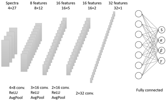 In the dynamical evolution of bottom quarks, our theoretical model produces a wide range of and values for the non-prompt in 5.02 TeV Pb–Pb collisions by varying the shadowing factor (which is denoted as S) and the three parameters of in Equation (5). This dataset will serve as the training data for the CNN. Experimental measurements were conducted to determine the nuclear modification factor for the non-prompt in three different centralities, as well as the elliptic flow coefficient of . In our approach, we treat the three centralities of as separate channels, while acts as an additional channel in the input layer of the CNN. The output layer of the CNN incorporates the corresponding parameter values in the diffusion coefficient and the shadowing factor, which are considered labels for the input data. Theoretical calculations based on the LICM model establish a mapping relationship between the parameter combination values and the experimental observables . Figure 1 provides a graphical representation of the network structure, which consists of four hidden layers, including the average pooling layers and fully connected layers. The ReLU activation function was chosen for these layers. The three output channels related to the diffusion coefficient parameters were projected to have positive values, while the channel associated with the shadowing effect was projected within the range of 0–1 when using the Sigmoid function.