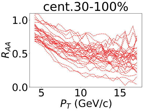 Some of the events that were randomly selected from one channel of the training dataset. The lines represent the nuclear modification factors of the non-prompt , which was calculated with different parameter values in the centrality of 30–100% in the 5.02 TeV Pb–Pb collisions.