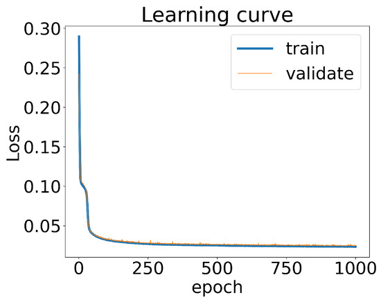 We partitioned 70% of the total datasets as the training data, while the remaining 30% of the datasets served as the validation data. By treating as the inputs for the CNN and the parameter values as labels, we could calculate the loss of the CNN for both the training and validation datasets. The learning curve shown in Figure 3 demonstrates that the loss decreased to below 5% after 250 training epochs. Notably, the loss of the CNN for the training datasets closely aligned with the loss observed when using the validation datasets. This indicated that the CNN model did not exhibit significant overfitting or underfitting.