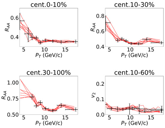 To consider the error bars of the experimental data about non-prompt in the 5.02 TeV Pb–Pb collisions, we sampled the values of and within the error bars of each data point, and we took them as inputs of the deep neural network. Some of the lines representing random events are plotted in the figures. The four figures represent the four channels of the network. The experimental data were cited from CMS Collaboration [34,35].