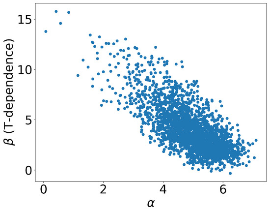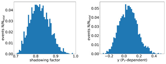 Consequently, we obtained 10 K different outputs, which are plotted in Figure 5. Each data point represents an individual event, with the corresponding values of and represented on the x- and y-axes, respectively. As previously mentioned, signifies the value of at critical temperature and zero momentum, while represents its temperature dependence. The majority of events were concentrated within the region of and . Furthermore, we also plotted the values of , which helped with characterizing the transverse momentum dependence, as well as the shadowing factor S that arises from the cold nuclear matter effect shown in Figure 6. From the distributions, it was observed that the majority of the events fell within the range of and , as depicted in Figure 6. The distribution of the events in the figure reflected the uncertainty in the parameter values that resulted from the experimental data errors, as well as the neural network structure.