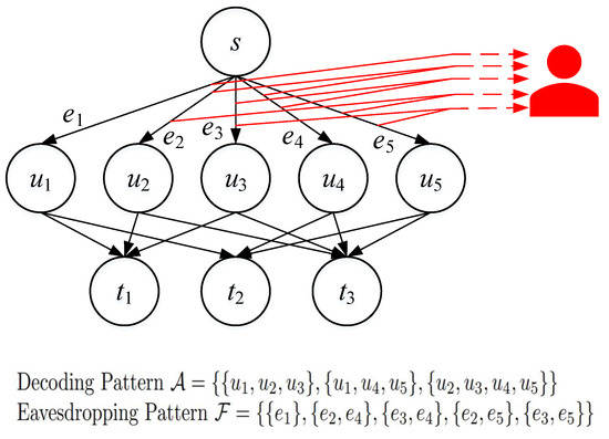 A linear scheme consists of the following: (1) for some fixed positive integer r, the message set is taken to be GF, i.e., message M can be written as r symbols in GF, i.e., ; (2) for some fixed positive integer k, the randomness introduced by the source node to enable the secure delivery of the message to the destination nodes is denoted as K, which takes values in a uniform fashion in its alphabet , which is GF. This means that the randomness K can be written as k symbols in GF as ; (3) the source node performs linear coding, i.e., for each channel , the linear coding coefficient is denoted by the matrix of size , where each element is in GF. Hence, the vector transmitted on channel is , which consists of elements and, therefore, does not exceed the capacity of the edge . Thus, the transmission constraint, i.e., (1), is satisfied. The linear scheme must also satisfy the security constraint and the decodability constraint. Under the assumption of linear schemes, the security constraint (2) becomes