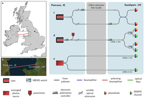 Field trial and experimental setup. (a) Geographic representation and (b) satellite image of the field trial. The ‘Rockabill’ link deployed by the company euNetworks [33] is drawn as an orange line with endpoints in the cable landing stations (CLSs) of Portrane, IE, and Southport, UK. The blue dot in the top panel denotes the University of York (UoY). The whole experimental setup and its subsystems, including the SNSPDs, were moved from the UoY to the two CLSs to perform the feasibility tests. (c–e) Subsystems of the experimental setup to characterise the optical phase (top), polarisation (middle), and entangled photon pair distribution (bottom) across the UK–IE link. Map data courtesy of GHSSG, Esri, Maxar, Earthstar Geographics, and the GIS User Community.