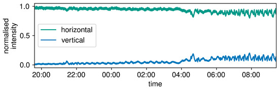 The polarisation behaviour of the current link (Figure 3) is also promising for the implementation of a polarisation-encoded BB84 QKD protocol. The polarisation remains stable over the course of about 90 min. After this time, it is necessary to re-align the system to assure continuous operation, which we consider straightforward given the long lapse of time. Over this period of time, the QBER remains below for the horizontal state and below for the vertical state , both of which are sufficiently low values for the implementation of this QKD protocol. This makes it possible to extract a positive SKR from the data using, in particular, the two values 0.6 (signal state) and 0.5 (decoy state). It is worth mentioning that other values of the photon flux, e.g., 1 for signals and 0.5 for decoys, would not lead to a positive SKR, showing a non-trivial role played by the selected parameters in the obtained results.