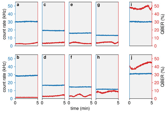 Total count rates (blue) and QBER (red) for different quantum states prepared in Portrane, as measured in Southport. Plots (a,c,e,g) correspond to a preparation of the state measured in the rectilinear basis ; plots (b,d,f,h) are similar, but for the state . Plots (i,j) correspond to the states D and A prepared, respectively, measured in the rectilinear basis . The first and last columns were generated with photon flux , whereas columns 2–4 depict the states at equal to 0.6, 0.5, and 0.4, respectively.