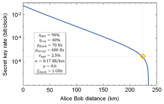Using and the parameters of the Rockabill link, we also report a simulation of the SKR for a variable distance between the end points Alice and Bob. The result is given by the blue line in Figure 5. On one hand, it shows that the simulation matches our experimental observation; on the other hand, it also shows how challenging the experiment is and underlines the necessity to conduct an experimental test. The length of the Rockabill link falls in the region where the SKR starts to roll over and goes to zero with a steep slope, leading to a zero SKR at 233 km. This is only 9 km away from our experimental point. To put this figure into context, it would suffice to add one additional beam splitter in Bob’s setup to add 3 dB of loss to the channel and result in a SKR of zero.