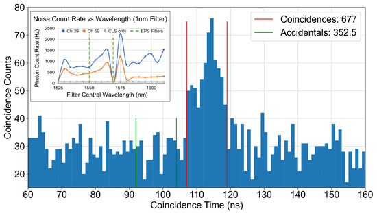 Histogram of the time delays between consecutive photon detections at the end of the two submarine channels. Pair photons from the EPS arrive with a fixed relative delay of 113 at a signal-to-noise ratio of 1.92, computed over the indicated red 12 coincidence window. The green lines indicates an exemplary coincidence window including only accidentals. The inlay shows the typical spectrum of the stray photon noise present in the channel, with the dashed lines indicating the wavelengths chosen for the EPS measurement.