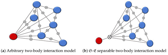 Two-body interactions between (red) and (blue). Lines with ⊗ depict interaction terms. (a) Most general scenario in which might separately interact with all qubits in . (b) Scenario with separable interaction, i.e., interacts with through a global tensor product structure; this scenario supports a pointer basis for .