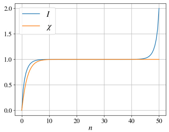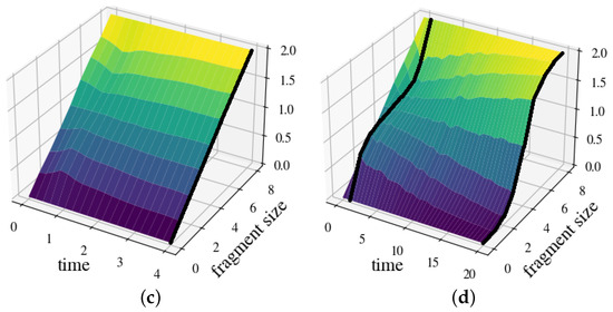 In this model, information about the observable can be registered in , but the eigenstates of this observable are not stable and, hence, not classically objective. This observation is further supported by Figure 3c, which does not exhibit any classical plateau form. Moreover, at all instants, is a linear function of the size of , which is a consequence of the complete absence of any redundancy.