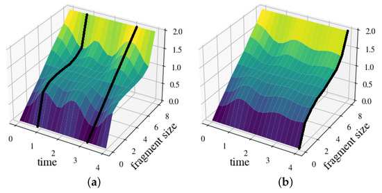 In Figure 3b, we depict the resulting mutual information. As expected, we observe that the classical plateau appears and disappears periodically and, hence, the information transfer is no longer irreversible. At instants at which the plateau completely vanishes, is linear in the fragment size. This indicates that the information about encoded in is distributed throughout the entire environment (no redundancy).