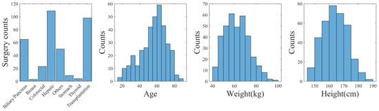 Considering the significant variability of data in real clinical settings, we implemented measures to ensure relative consistency. Specifically, we limited the age range of the subjects to those over 18 years old, with a weight greater than 40 kg, a height greater than 145 cm, and a body mass index between 16 and 35. Furthermore, measurements obtained in lateral positions as well as suspected excessive blood loss (SBP < 80 mmHg) were excluded from the analysis. For this study, we included 361 patients who underwent various surgical procedures, consisting of 213 male and 148 female subjects. Vital signals, such as BP, PPG, and CO, were collected from these patients at a sampling rate of 50 Hz. Importantly, none of the patients included in this study had undergone vascular or heart surgeries. We also collected data from 40 healthy subjects, consisting of 17 males and 23 females, with similar physiological measurements. For a comprehensive overview of participants’ information, please refer to Figure 1 and Table 1. We also presented the 1st percentile (1%) and 99th percentile (99%) for each parameter to establish the boundaries of the data. Outliers in systolic blood pressure (SBP) and diastolic blood pressure (DBP) were identified as measurements outside this range. These outliers were then removed to minimize the potential impact of erroneous measurements.