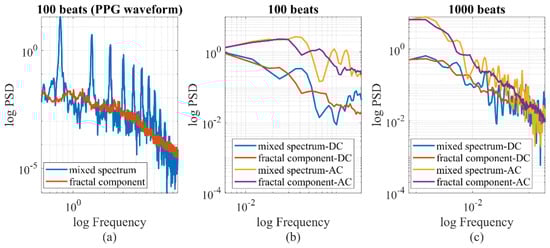 To separate fractal and oscillatory components in the PPG signal, we employed the irregular-resampling auto-spectral analysis (IRASA) technique [38]. The IRASA method addresses limitations of the straightforward power spectrum method when prominent oscillations may deviate the power spectral density (PSD) from a power-law distribution [39]. It uses a resampling technique with multiple noninteger pairwise factors, including positive numbers and their reciprocals. By calculating the geometric mean of the auto-power spectra for each pair of resampled signals, the power associated with the oscillatory component was redistributed away from its original frequencies (fundamental and harmonic) by a frequency offset that varies with the resampling factor. In contrast, the power attributed to the fractal component maintains a consistent power-law statistical distribution, regardless of the resampling factor. An example of the IRASA is demonstrated in Figure 4. The analysis included two different signal lengths, 100 and 1000 heartbeats. Specifically, for the 100-heartbeat segment, both the IRASA of the PPG waveform at 50 Hz and the beat-to-beat baseline (DC) and pulsatile amplitude (AC) of the PPG were conducted [24]. The chaotic components exhibited higher noise levels and deviated from linearity at lower frequencies, as shown in Figure 4a. This deviation was likely due to multifractality at different timescales [38]. Figure 4b exhibited a higher level of noise compared to Figure 4c. With a longer recording time and lower sampling rate, minimal oscillation was observed in Figure 4c, suggesting that the long-term chaotic components are the main contributor to the power and require a longer duration to stabilize.