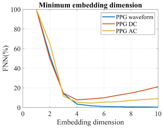 To compare with the fractal analysis, we tested several popular entropy measures. The same three sampling approaches described in Section 2.5.2 were utilized. In order to improve the precision of the entropy estimation, we first calculated the embedded dimension. The embedded dimension refers to the number of variables or dimensions required to represent a complex or high-dimensional dataset in a lower-dimensional space. In our study, we employed the false nearest neighbors (FNN) method [44], as shown in Figure 6, to determine the embedded dimension. Based on the FNN calculation, we set the embedded dimension as four. It is worth noting that the decrease in the FNN of the PPG–AC and PPG–DC was not consistently monotonic, which may be attributed to the uneven sampling time of the PPG–DC and PPG–AC.