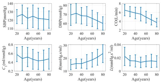 A total of 652,313 windows were collected from the database, and the age stratified distribution of hemodynamic parameters is shown in Figure 7. The error bars in the figure represent the standard deviation of the respective hemodynamic parameters. Our analysis revealed several significant trends with age. DBP, CO, and C1 exhibited a significant decrease, whereas R showed a significant increase. On the other hand, SBP and L did not exhibit a significant trend with age.