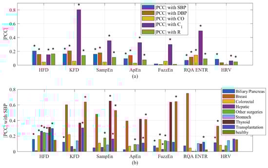(a) Correlation of complexity measures with hemodynamics. (b) Correlation of complexity measures with SBP stratified by health conditions. PCC could be either positive or negative. * indicates a significant inter-subject (cohort) correlation (p < 0.05).
