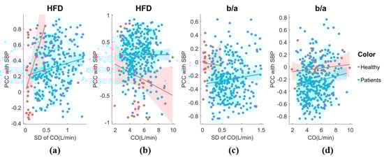 (a) The sensitivity of HFD to SBP exhibits variability in response to CO fluctuation. The analysis includes both healthy individuals and patients. A generalized linear model fit shows the 95% confidence interval (line + shaded area). (b) The relationship between the sensitivity of HFD to SBP and CO. (c) The relationship between the sensitivity of b/a to SBP and CO fluctuation. (d) The relationship between the sensitivity of b/a to SBP and CO.