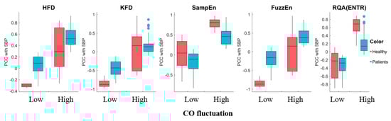 Most of these complexity feature sensitivities displayed a significant trend depending on CO variation, indicating that variations in hemodynamics can result in different temporal patterns, as shown in Figure 11. SampEn exhibited consistent increases in sensitivity to SBP with higher CO fluctuations. On the other hand, HFD and FuzzEn demonstrated increased sensitivity to SBP with higher CO fluctuations, but only in surgery patients. RQA(ENTR) showed increased sensitivity only for healthy subjects. Interestingly, the KFD displayed decreasing sensitivity, indicated by lower |PCC| values, suggesting a different origin compared to the HFD. We categorized the CO fluctuation as either “low fluctuations” or “higher fluctuations” by dividing it with the median value. The morphological features, SPMEAN and SPVAR, exhibited similar performances to b/a, while other features generally showed insignificant changes in sensitivity with CO fluctuation. We have shown selected features in the Supplementary Figure S3.