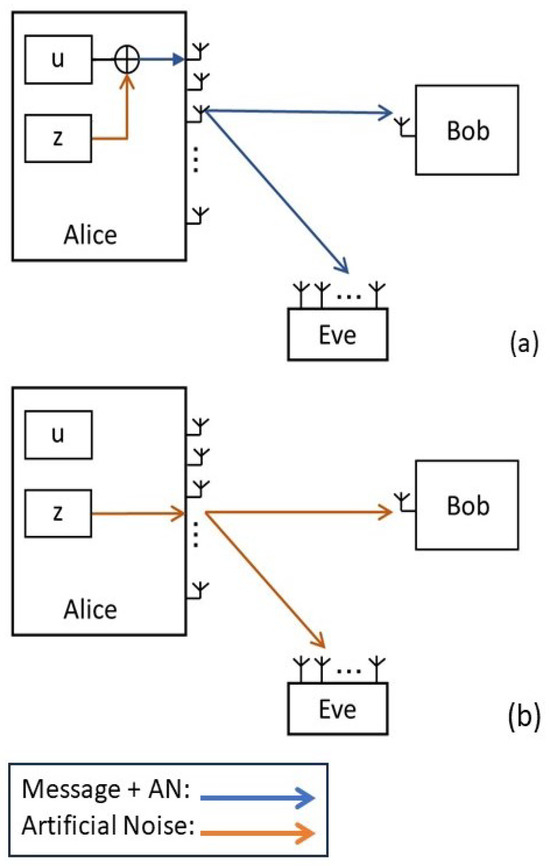Figure 1. Two-phase transmission model: (a) Alice transmits noise-injected message in phase 1. (b) Alice transmits only AN in phase 2.