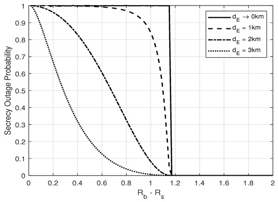 Figure 3. Secrecy outage probability, P S O , versus R b R s for different eavesdropper distance d E ; α = 0.8 , N A = 2 , and N E = 2 .