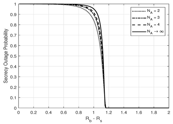 Figure 4. Secrecy outage probability, P S O , versus R b R s for different values of N A ; α = 0.8 , N E = 2 , and σ g 2 = σ h 2 .