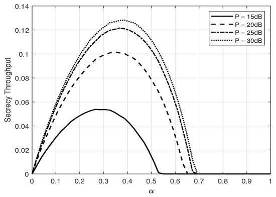 Figure 5 and Figure 6 depict the zero-outage secrecy throughput of the system versus α and P (dB), respectively. One can see that there exists an optimum ratio between the secret message and AN powers to maximize throughput, and the optimal power ratio increases when the transmit power increases. One can also see that when optimal α is applied, the secrecy throughput converges to a constant. This convergence of the secrecy throughput is due to the interference from estimation error.