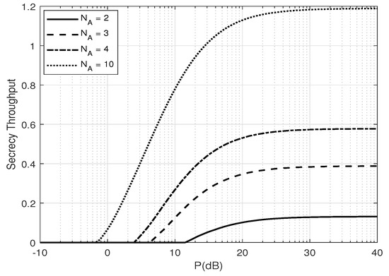 Figure 6. Secrecy throughput, η , versus P when the optimal α is applied for a different number of transmit antennas N A ; β = 0.1 and δ = 0.1 .