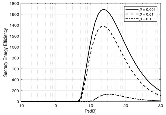 Figure 7 and Figure 8 depict the SEE versus the average total transmit power P (dB) for different numbers of transmit antennas, N A , and estimation error coefficient, β , at Alice. There exists an optimal P to maximize energy efficiency and that energy efficiency increases as the estimation error decreases. Furthermore, there also exists an optimal N A to maximize energy efficiency, as in Figure 9, depicting the SEE versus Alice’s numbers of transmit antennas for different transmit powers P (dB). This is because increasing the transmit power or number of transmit antennas significantly increases the total power consumption while the secrecy throughput stays constant (as shown in Figure 6), hence reducing the energy efficiency.